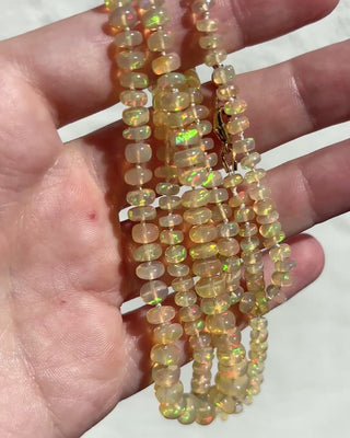 This pastel-hued Ethiopian Opal Necklace reminds me of my favorite candy necklaces from childhood. Long enough to throw on over your head without dealing with the clasp, making it perfect for quick outfits. Made with pastel-hued, milky opals in a yellow tone. Hand-knotted on ivory colored silk cord.
