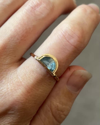 I set this cloudy blue sapphire in a hand-carved bezel with fluted sides that was inspired by the basin of a water fountain - forever holding a drop of this cool blue tropical water. The shape of this half moon pairs well with our Perla Onda Band. This sapphire was ethically sourced from Montana and cut by Tatum Gems.