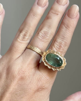 A responsibly sourced Moyo Gems aquamarine (that is so green it's close to classifying as an emerald) is set in a hand-carved sculptural ring cast in 14k yellow Fairmined Gold. The shape of this ring is inspired by beautiful Italian fountains with a scalloped face, dimensional setting, and scrolled shoulders.