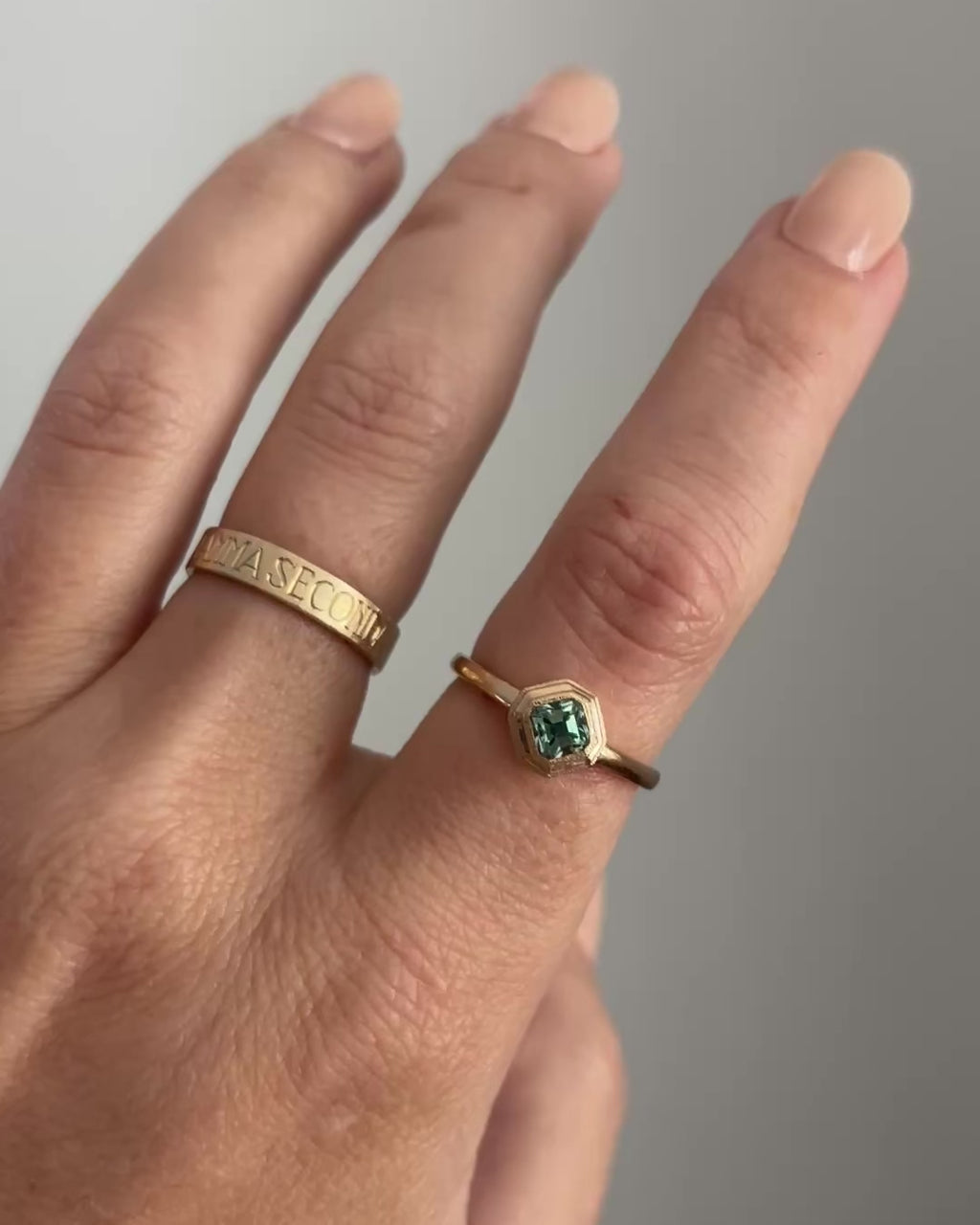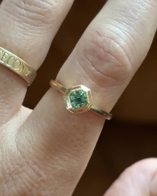 A bright and clean asscher cut mint beryl is set on a point in this hand-carved stepped bezel setting. The bezel features a fine hammered texture to mimic the sand on a pristine beach. The mint beryl was sourced from Ethiopia via Agere Treasures.